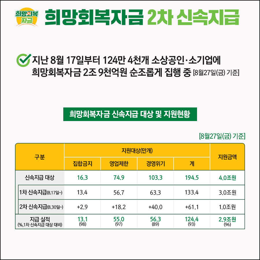 한편, 중기부는 지난 8월 17일부터 8월 27일까지 124만 4천개 소상공인·소기업에 2조 9천억원의 희망회복자금을 순조롭게 집행하고 있다고 합니다.