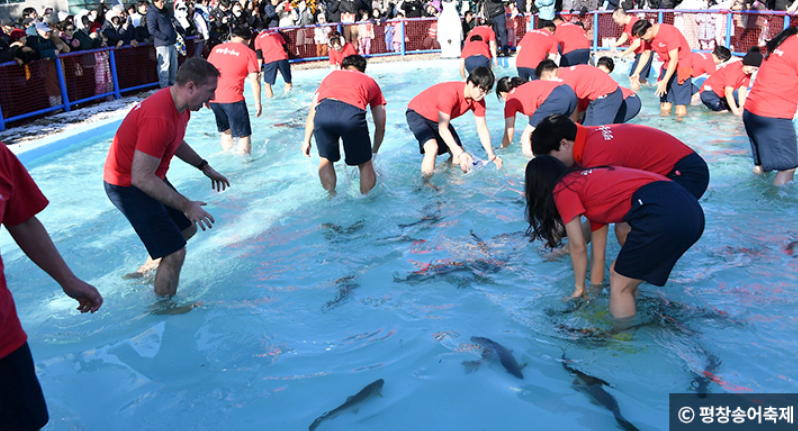바로 이곳에 우리 선조들의 삶의 핍박을 축제로 승화시켜 '눈과 얼음, 송어가 함께하는 겨울이야기'라는 주제로 매년 겨울에 평창송어축제가 한마당 펼쳐진다고 합니다.