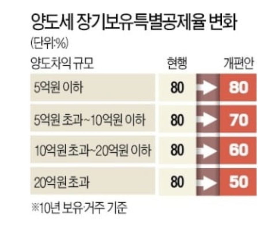 이런 장기보유공제 축소는 오래 보유할수록 세 감면혜택이 커져 주택보유자들이 주택을 팔지 않고 버티게 만드는 유인을 없애기 위한 의도로 보인다합니다.