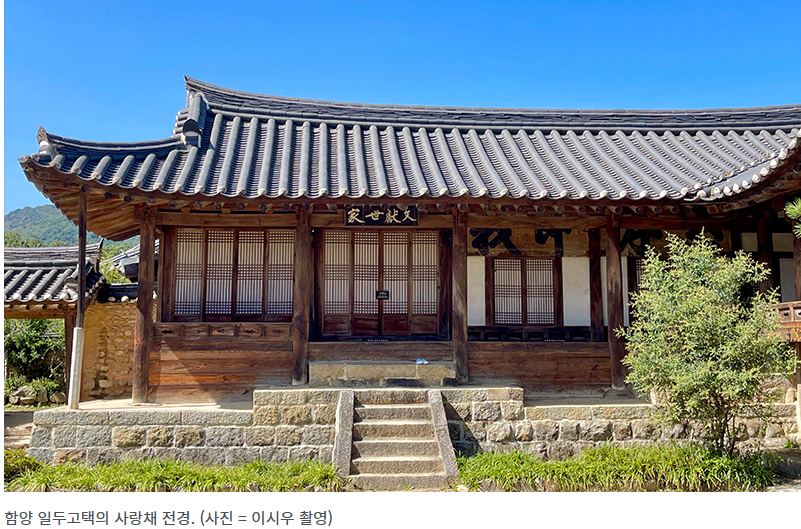 함양 일두고택(국가민속문화재)은 일두 정여창의 집입니다. 성리학의 대가 정여창은 동방오현에 오른 유학자로 평가받습니다. 지금 남은 고택은 정여창이 세상을 뜨고 약 1세기가 지나 건축했습니다. 입구 솟을대문에 정여창 가문이 나라에서 받은 정려 5개가 있습니다. 사랑채에는 정여창의 후손이 사는 집이란 사실을 말해주는 문헌세가 편액이 걸렸고, 그 뒤 방문 위에는 충효절의라고 커다랗게 쓴 종이가 붙었습니다.