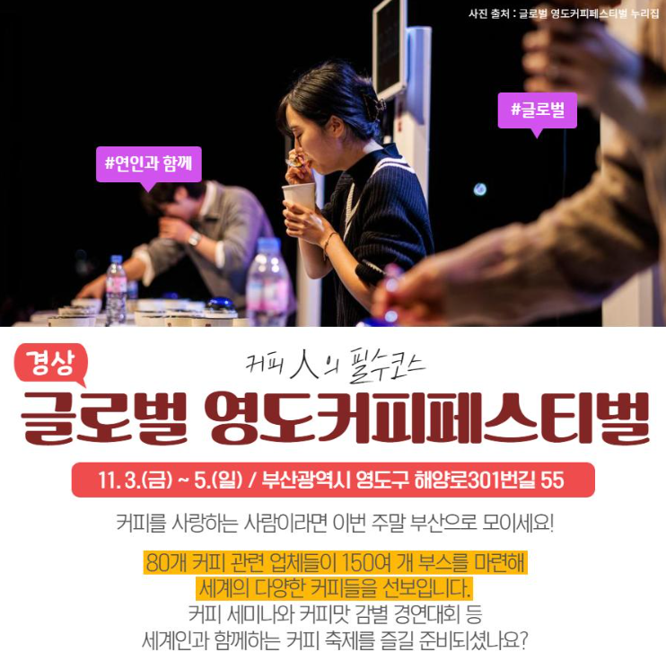 80개 커피 관련 업체들이 150여 개 부스를 마련해 세계의 다양한 커피들을 선보입니다. 커피 세미나와 커피맛 감별 경연대회 등 세계인과 함께하는 커피 축제를 즐겨보세요!