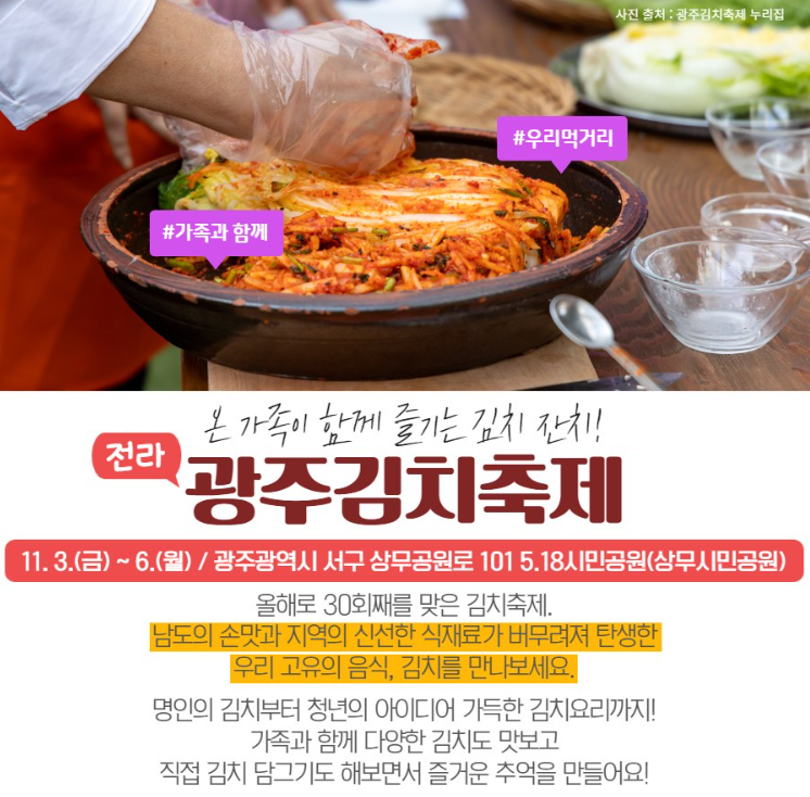 명인의 김치부터 청년의 아이디어 가득한 김치요리까지! 가족과 함께 다양한 김치도 맛보고 직접 김치 담그기도 해 보면서 즐거운 추억 만들어보세요!