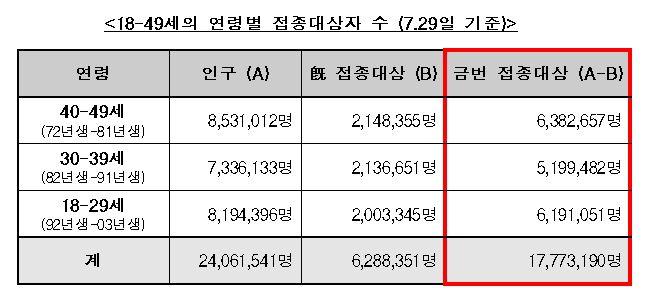 18~49세 가운데 각 지방자치단체가 우선 접종이 필요하다고 판단한 200만명은 8월 17일부터 9월 11일까지 전국 예방접종센터에서 화이자나 모더나 백신을 접종한다고 합니다.