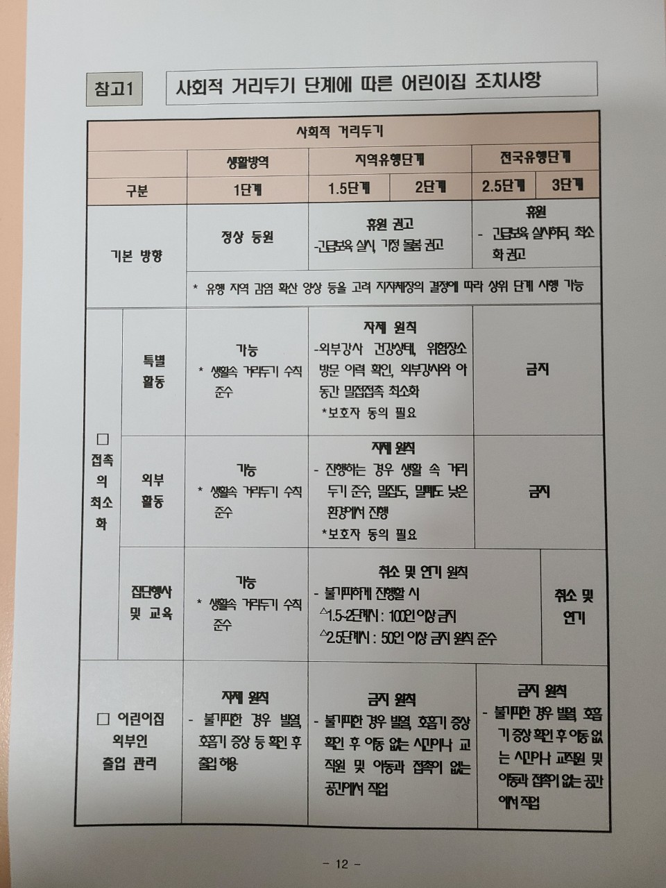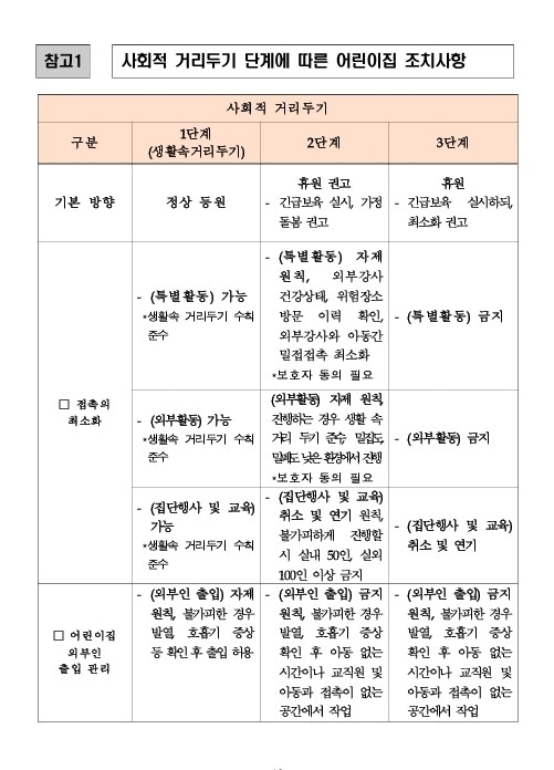 어린이집 사회적 거리두기 단계별 조치사항(3단계 분류)
