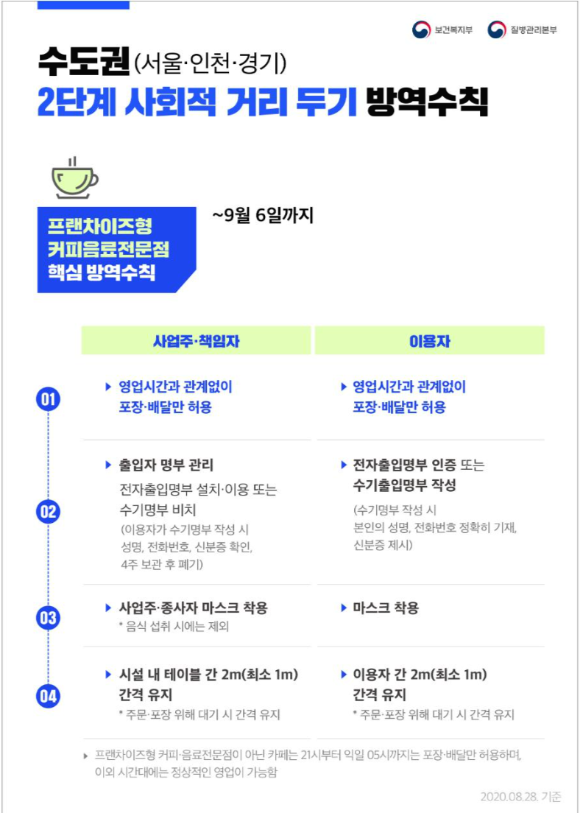 수도권 2단계 프랜차이즈형 커피음료전문점 핵심 방역수칙
