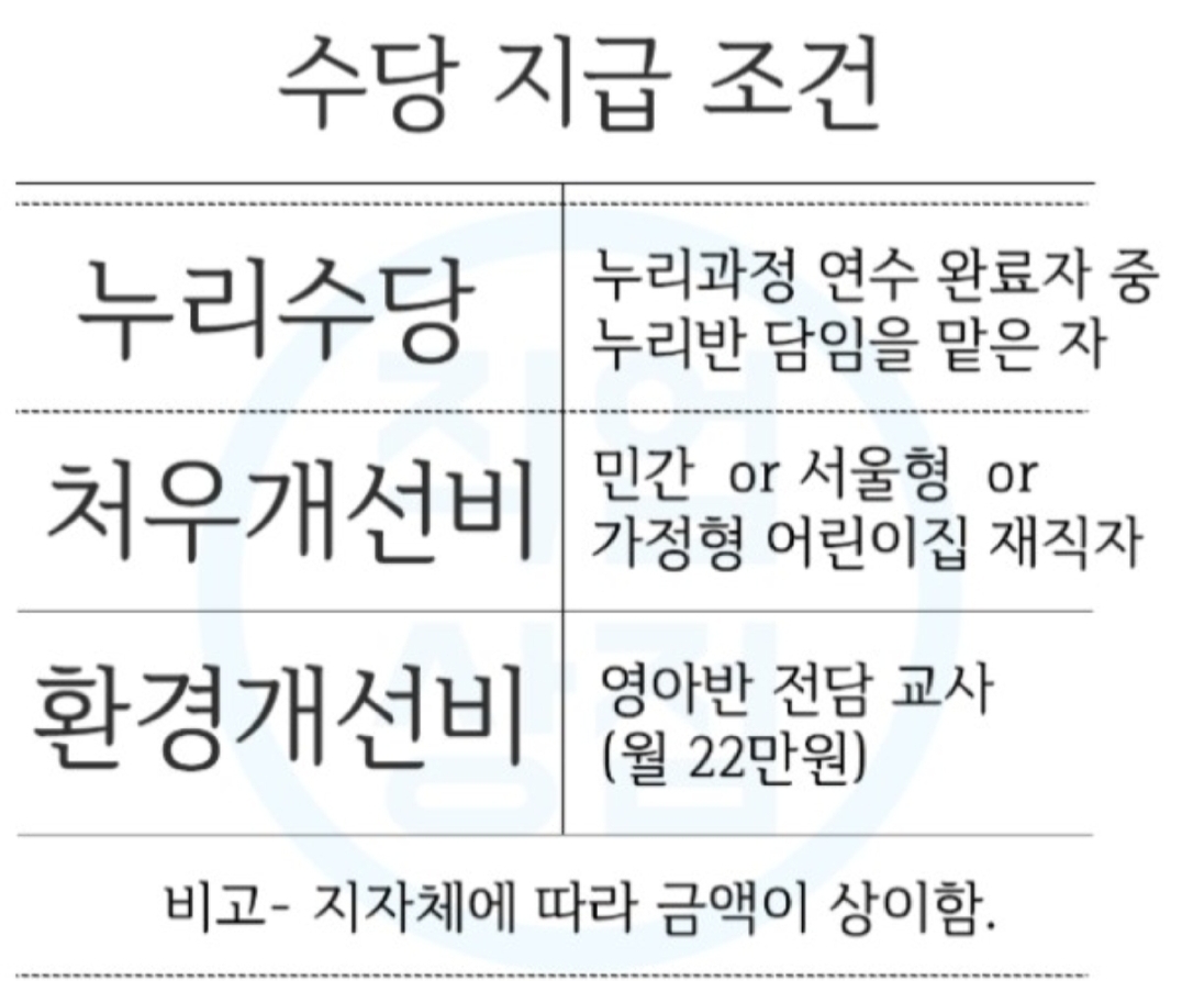 그외 도에서 주는 10만원(평가인증 안받은 곳은 5만원)과 시에서 주는 10만원(4개월 이후부터)가 있습니다. 또, 추가적으로 농어촌 지역(읍에 해당)에 근무를 하시는 경우는 11만원을 추가로 지급한다고 합니다.