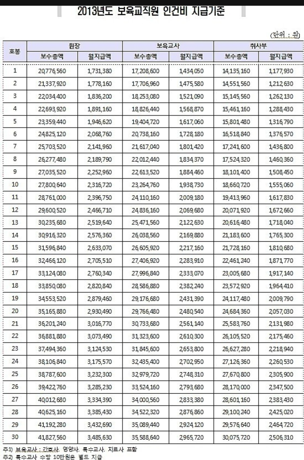 아래는 2013년도부터 2020년도까지 보육교사 월급을 표로 비교해보겠습니다.