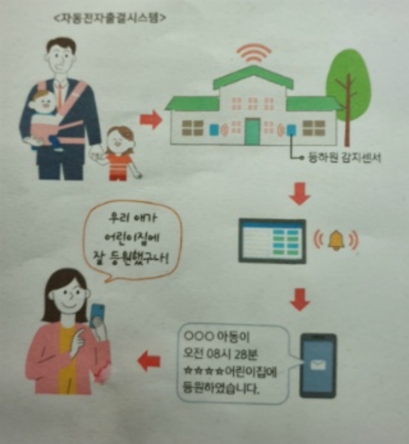 자동전자 출결시스템이 도입되어 부모님에게 아동의 등하원 알림이 제동됩니다.