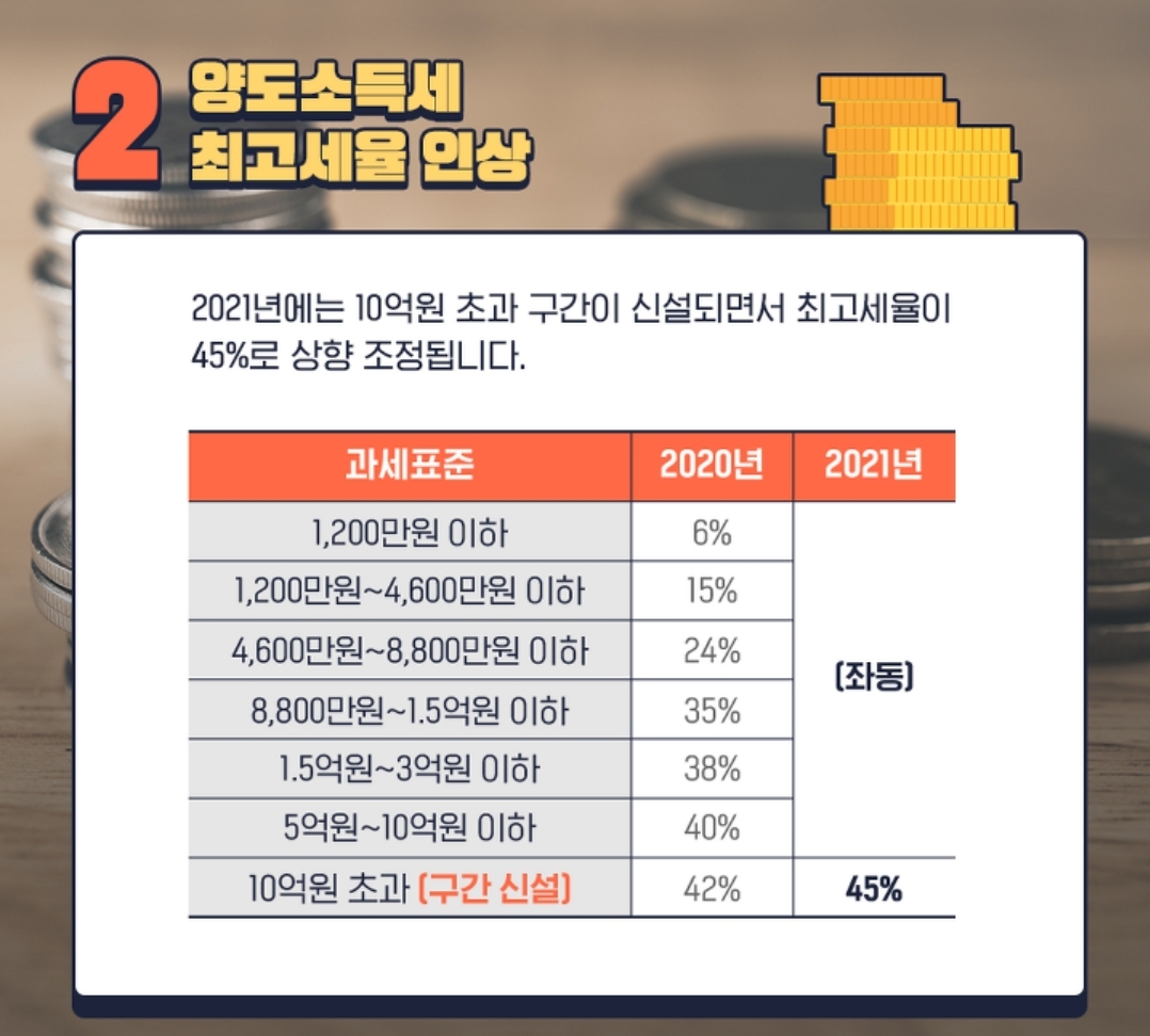 2021년도에는 10억원 초과 구간이 신설되면서 42%였던 세율이 최고세율 45%로 상향 조정된다고 합니다.