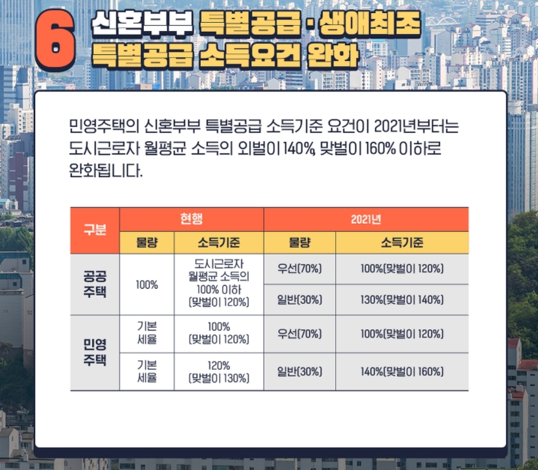 2021년도부터는 신혼부부 특별공급·생애최초 특별공급 소득요건이 완화가 되는데, 2021년부터 민영주택의 신혼부부 특별공급 소득기준 요건의 경우 도시근로자 월평균 소득의 외벌이 140% 맞벌이 160%이하로 완화된다고 합니다.