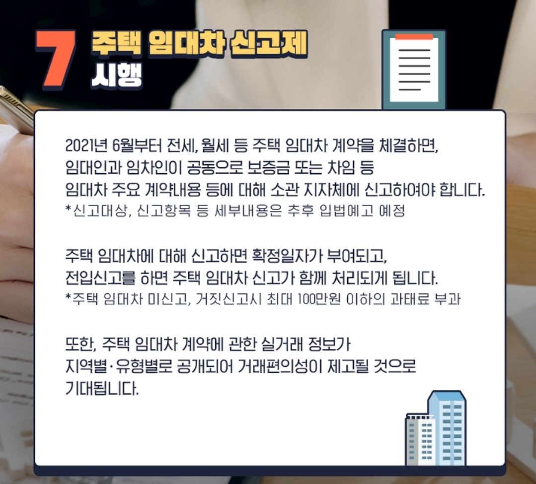 2021년 6월부터 전세, 월세 등 주택 임대차 계약을 체결하면, 임대인과 임차인이 공동으로 보증금 또는 차임 등 임대차 주요 계약내용 등에 대해 소관 지자체에 신고해야 한다고 합니다.