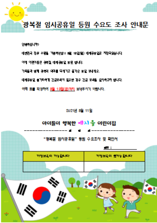 광복절 임시공휴일 등원 수요조사 안내문 서식 다운받기