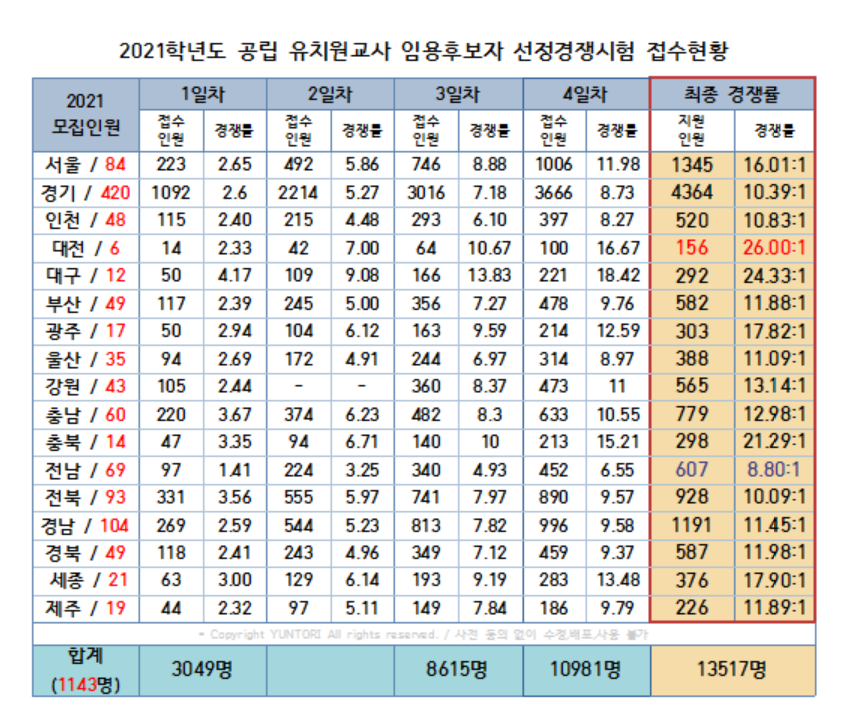 2021학년 공립 유치원교사 임용후보자 선정 경쟁시험 접수현황
