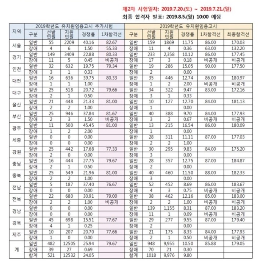 2019학년도 유치원 교원 임용 추가 시험 1차 함격 점수