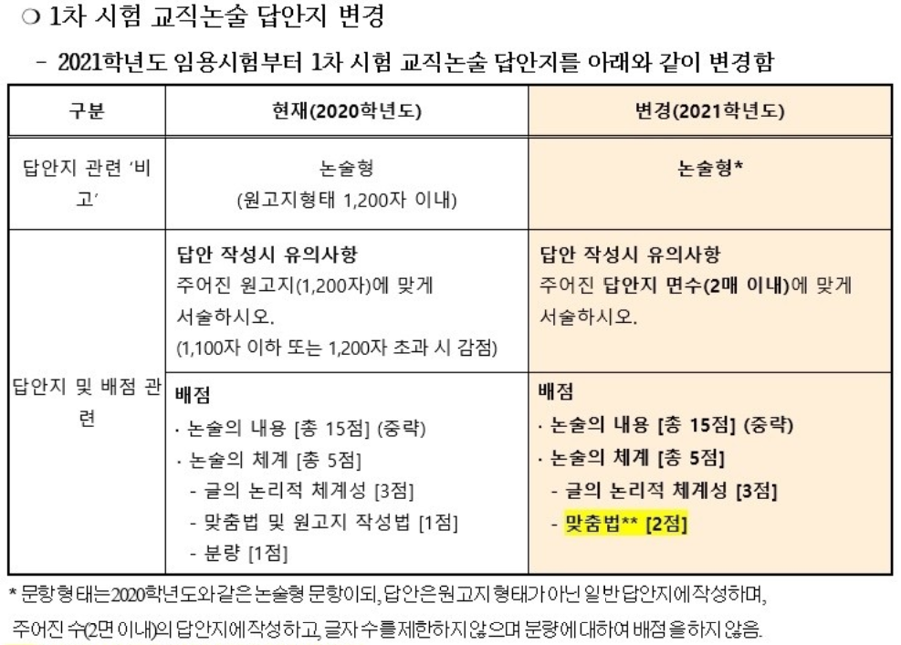 2021학년도 임용시험 1차 시험 교직논술 답안지 변경