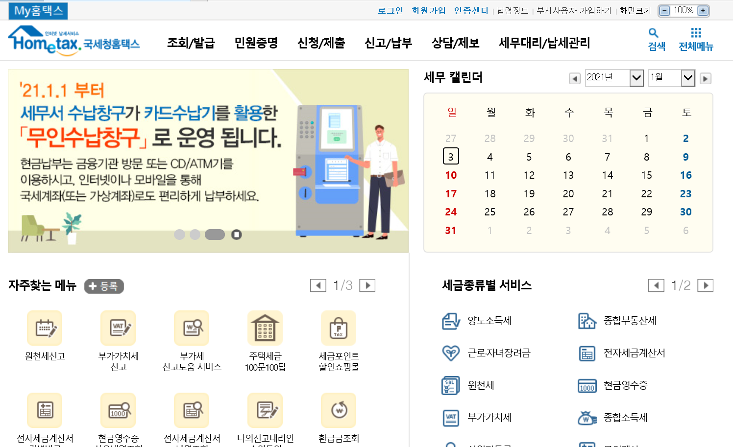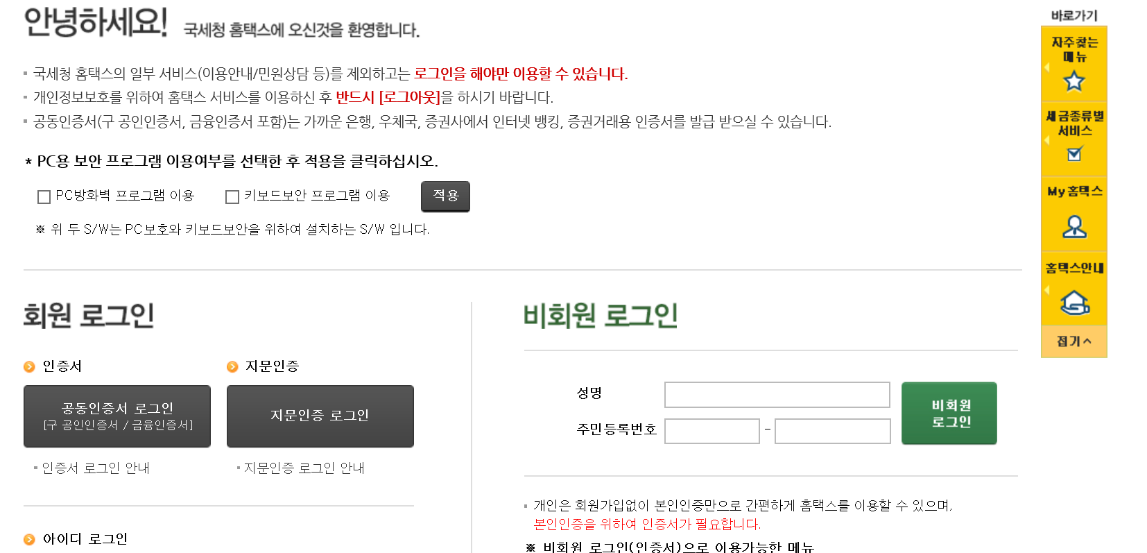 개인은 회원가입없이 본인인증만으로 간편하게 홈택스를 이용할 수 있으며, 본인인증을 위하여 인증서가 필요합니다.