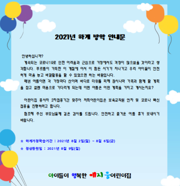 이번 저희 어린이집 코로나 백신으로 인한 하계방학 안내문 공유합니다.