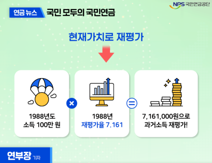 연금을 처음 받는 대상자의 연금액 산정 시 과거 소득을 재평가율에 따라 현재가치로 재평가하는 것인데, 예를 들자면 만약, 올해 연금을 처음 받는 B씨의 1988년도에 소득이 100만 원이었다면 1988년 재평가율인 7.161을 곱하여 현재가치로 재평가한 716만 1,000원을 기준으로 연금액을 산정한다고 합니다.