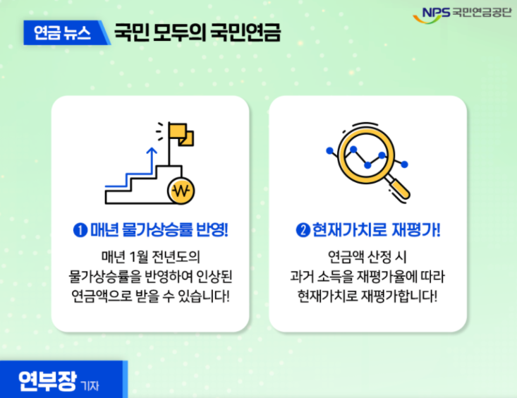 국민연금은 장기적인 노후소득보장을 목적으로 하기때무에 국민연금 연금액이 실질가치를 보장하는 장치가 있다고 합니다.