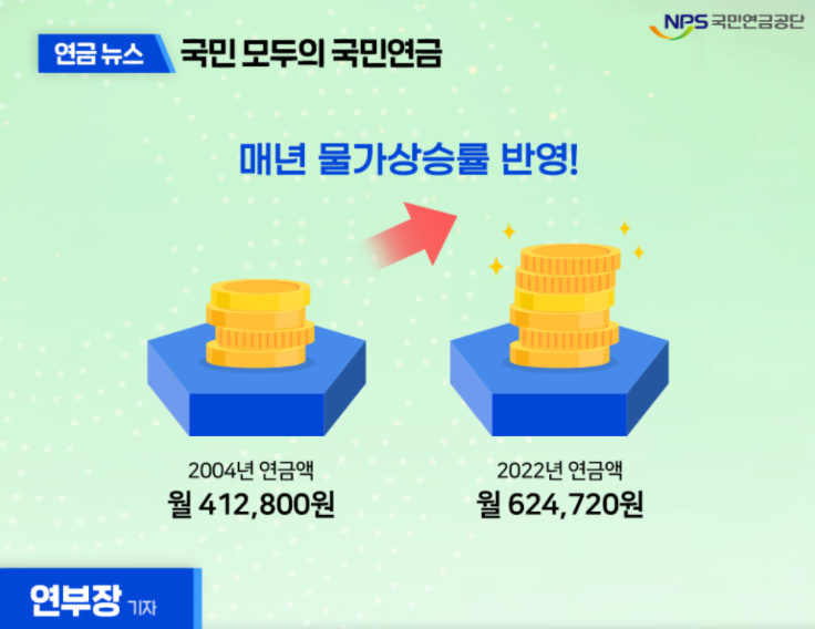 매년 1월 전년도의 물가상승률을 반영하여 인상된 연금액을 받을 수 있는데, 예를 들자면 2004년부터 지금까지 국민연금을 받고 있는 A씨가 처음 연금을 받기 시작할 당시의 연금액은 월 412,800원이었지만 물가상승률을 반영해 2021년에는 월 609,000원을 받았고, 2022년에는 물가상승률 2.5%를 반영하여 월 624,720원을 받게 되는 것이라고 합니다.