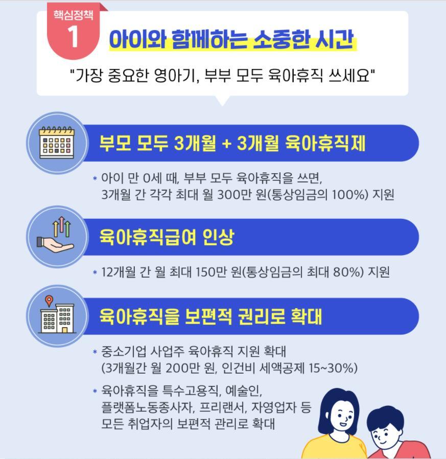 생후 12개월 미만 자녀가 있는 부모가 모두 3개월씩 육아휴직을 하면 각각 월 300만원(통상임금 100%)을 지급하는 것으로, 부모 중 한 명만 휴직할 때보다 육앟직급여가 많아지는 셈입니다.