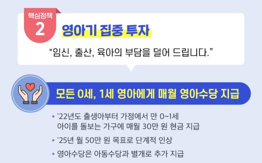 이는 모든 만 0~1세 영아에게 매월 일정 수당을 지급하는 것으로, 현재 만 7세 미만에게 지급되는 '아동수당'(워10만원)과는 별개라고 합니다.