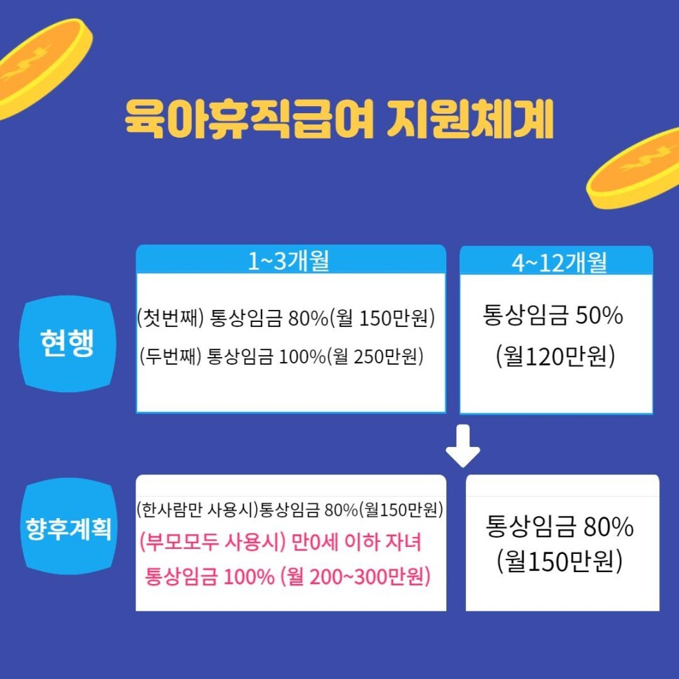 출산 후 소득 감소를 완화하기 위해 육아휴직급여의 소득대체율도 높인다고 합니다.