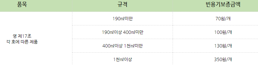 이 제도에 해당되는 유리병으로는 「주세법」제4조제2호의 발효주류 및 제3호의 증류주류, 음료류, 「먹는물관리법」제3조제1호에 따른 먹는물이 있다고 합니다.