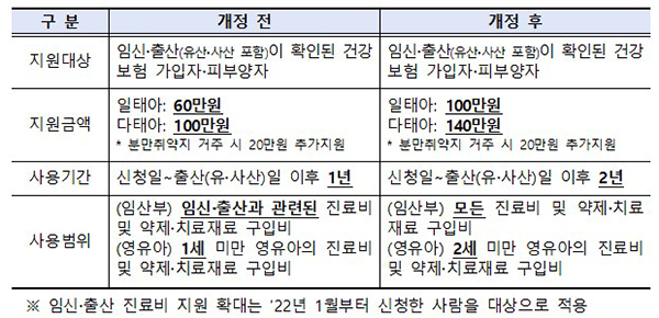 또한, 사용기간이 출산(유산·사산)일 이후 1년에서 2년으로 연장되며, 지원항목은 임신·출산과 관련된 진료비 및 약제·치료 재료 구입비로 확대한다고 합니다.
