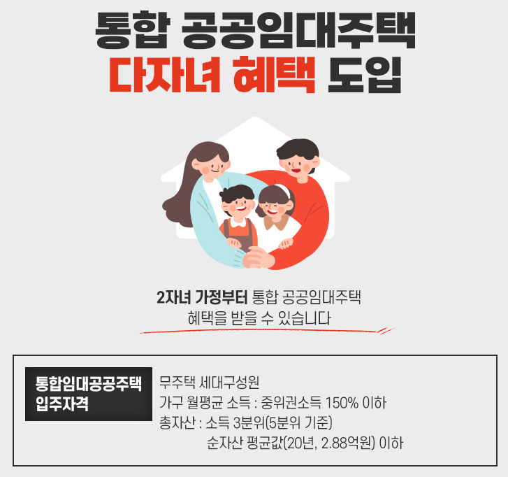 2자녀 가정부터 통합 공공임대주택 혜택을 받을 수 있다고 합니다.