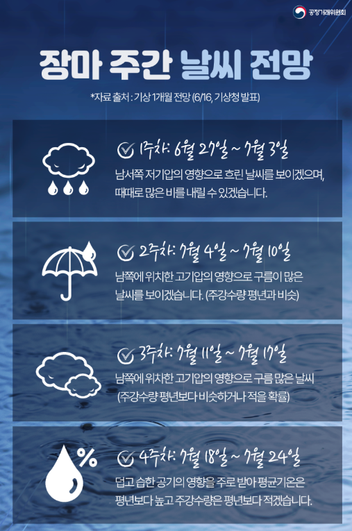 그래서 오늘은 기상청에서 발표한 장마 평년값과 장마철 주별 예고, 장마철 높은 습도로부터 실내를 지키는 천연 제습제까지 알아보겠습니다.