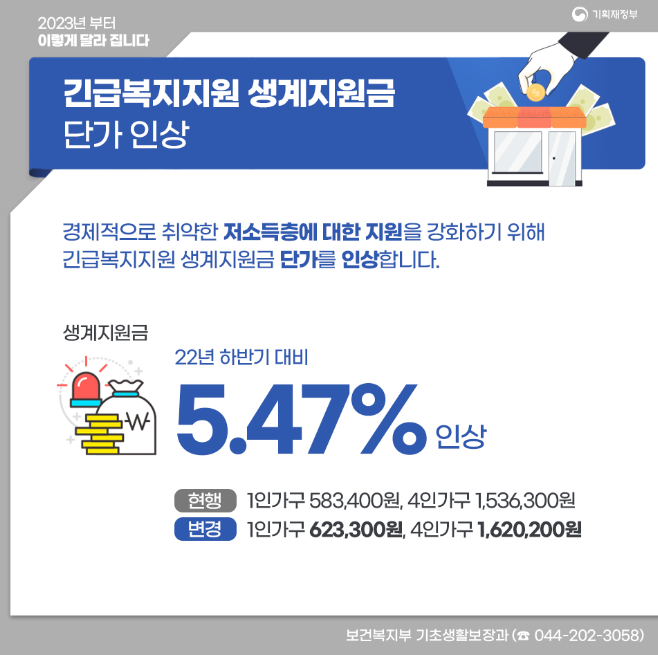 경제적으로 취약한 저소득층에 대한 지원을 강화하기 위해 긴급복지지원 생계지원금 단가를 인상합니다.