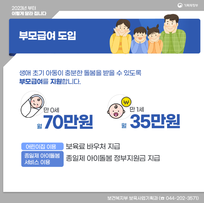 생이 초기 아동이 충분한 돌봄을 받을 수 있도록 부모급여를 지원합니다.