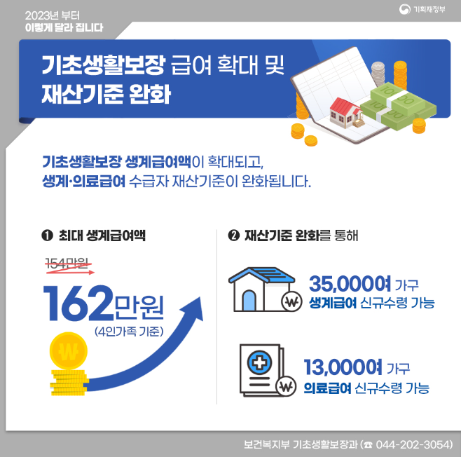 기초생활보장 생계급여액이 확대되고, 생계·의료급여 수급자 재산기준이 완화됩니다.