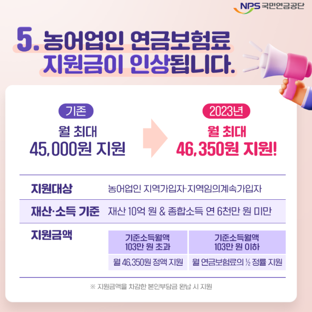 5. 농어업인 연금보험료 지원금이 인상됩니다.