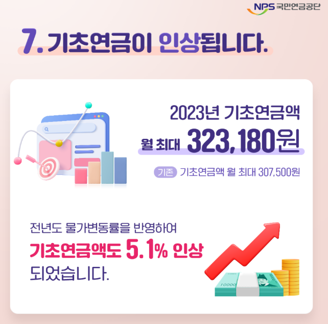 국민연금과 마찬가지로 전년도 물가변동률을 반영하여 기초연금액도 5.1% 인상되었는데, 기존 월 최대 307,500원에서 월 최대 323,180원으로 인상되었습니다.