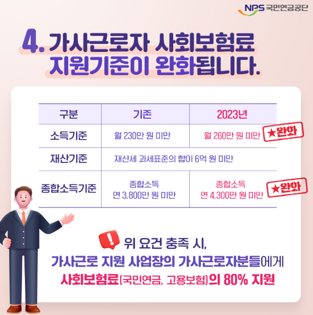 4. 가사근로자 사회보험료 지원기준이 완화됩니다.