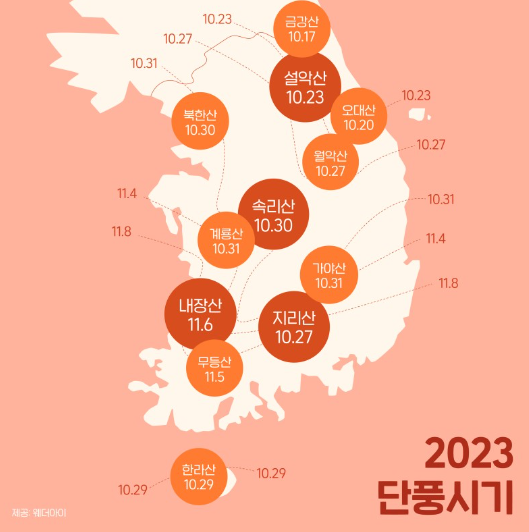 난풍 나들이를 나갈 계획이 있다면 2023 단풍시기 지도를 참고하시면 좋을 것 같습니다.