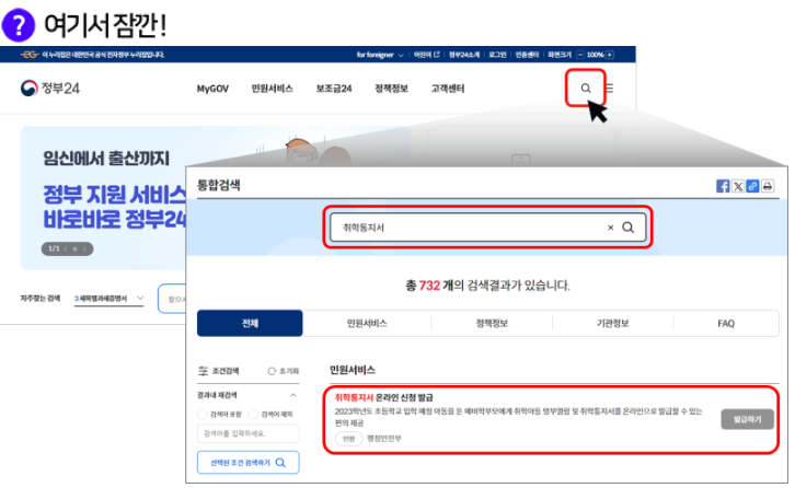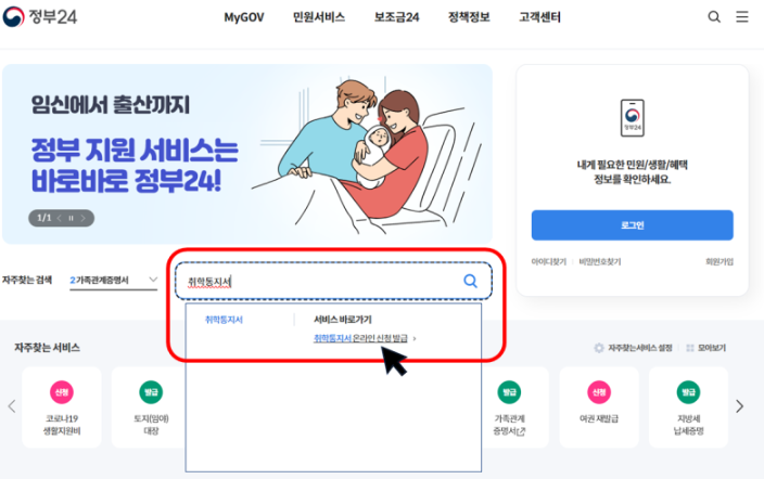 정부24 메인 페이지에서 '취학통지서'를 검색어로 입력한 후, 취학통지서 온라인 신청 발급 서비스를 클릭해 줍니다.