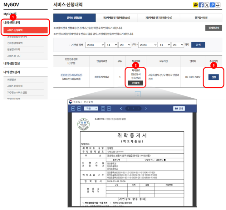 1. MYGov > 나의 신청 내역 > 서비스 신청내역 페이지에서 신청한 민원을 확인합니다.
