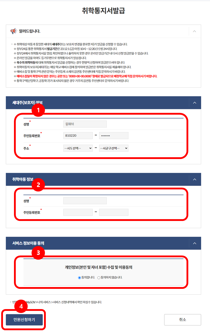 2. 예비 취학 아동의 이름과 주민등록번호 정보 입력하기