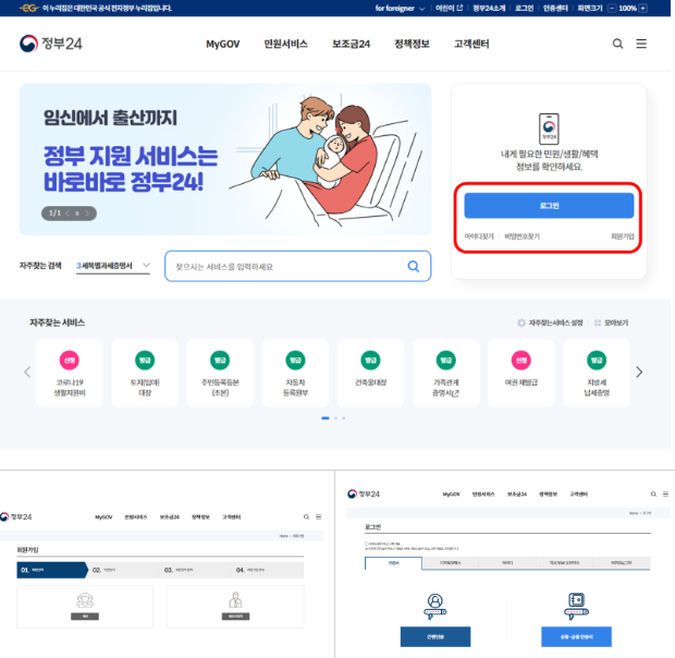※ 회원가입 및 로그인 관련하여 상세한 이용방법 안내는 정부24 이용가이드에서 확인하시면 됩니다.
