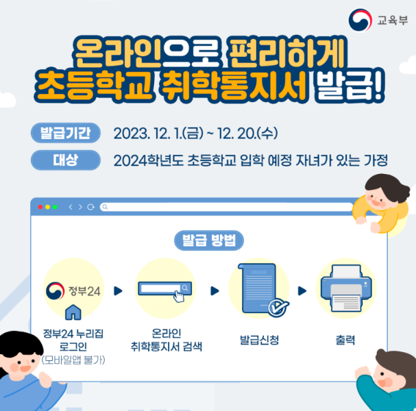 오늘은 2024년도 초등학교 입학 취학통지서 발급방법에 대해 알아보겠습니다.