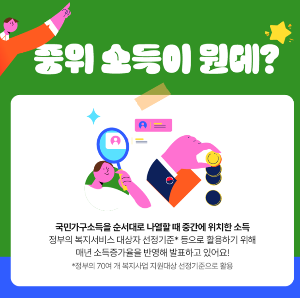 국민가구소득을 순서대로 나열할 때 중간에 위치한 소득을 말합니다. 정부의 복지서비스 대상자 선정기준 등으로 활용하기 위해 매년 소득증가율을 반영해 발표하고 있습니다.