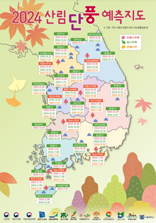 2024년 발표된 웨더아이의 자료에 따르면 중부지방과 남부지방은 10월 중순에서 마지막 주에 처 단풍을 볼 것으로 예측했습니다.