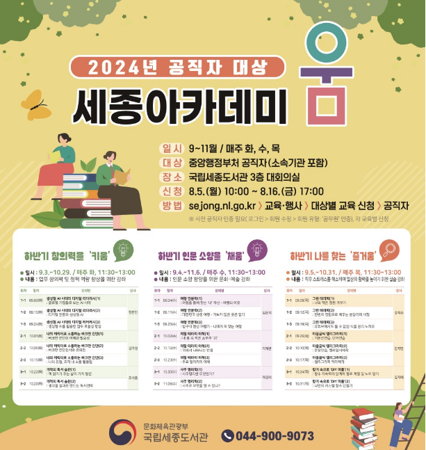 국립세종도서관은 9월 3일(화)부터 11월 6일(수)까지 매주 화·수·목요일 오전 11시 30분부터 오후 1시까지 공직자 대상 '세종아카데미 움'을 운영한다고 합니다. 이 프로그램은 중앙행정기관 공직자의 정책역량 강화와 인문학적 소양을 함양하고자 2014년부터 시작된 교육 프로그램이라고 합니다.