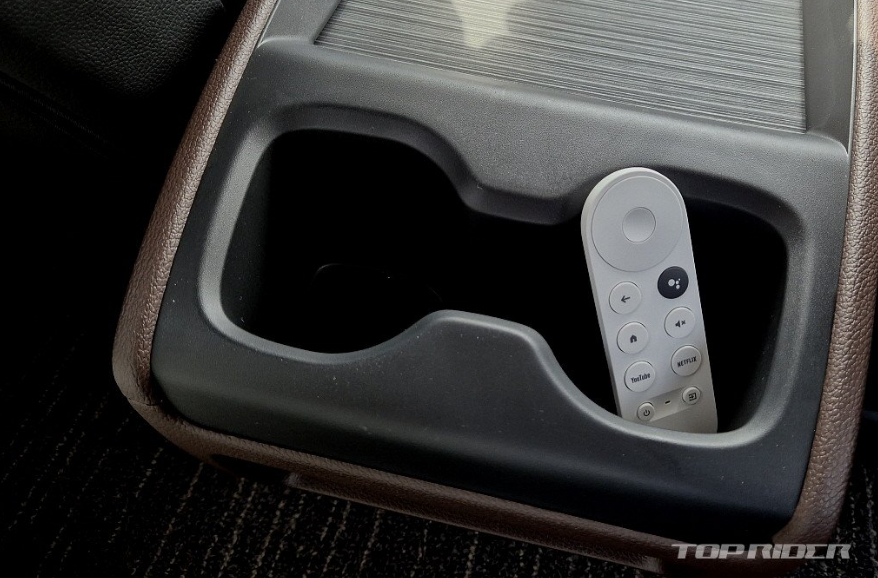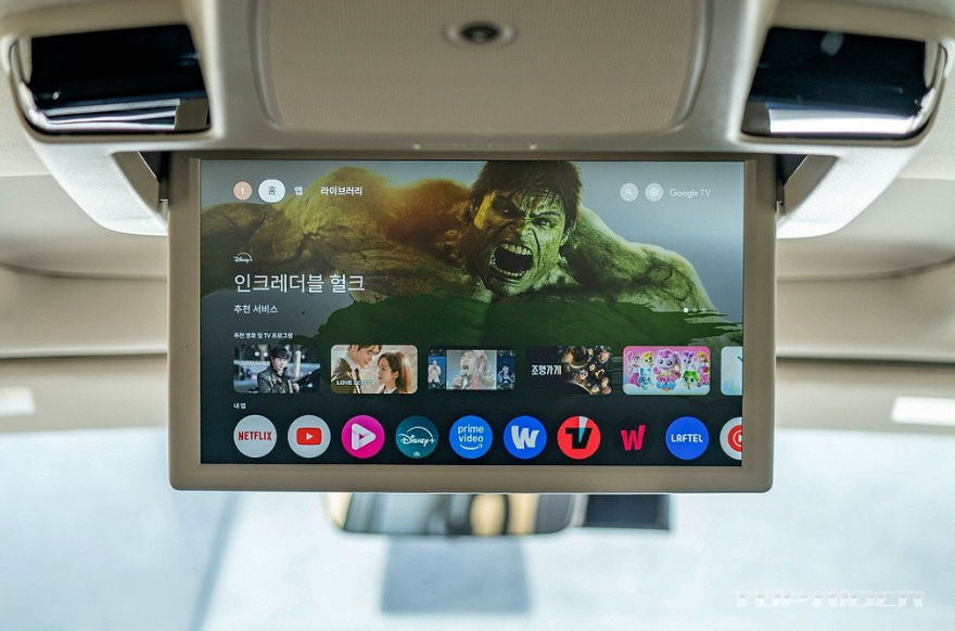 2열에서는 새롭게 단장한 리어 인포테인먼트 시스템이 눈에 띕니다. 천장에서 내려오는 타입으로, 2열 시트를 뒤로 약간 눕히고, 블라인드를 올리면 좋은 시청 자세가 만들어집니다. 테더링을 통해 유튜브나 OTT를 시청할 수 있는데, 탑건 매버릭 같은 영화를 시청해 보면 사운드가 상당히 좋습니다.