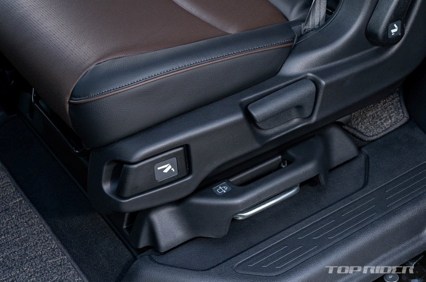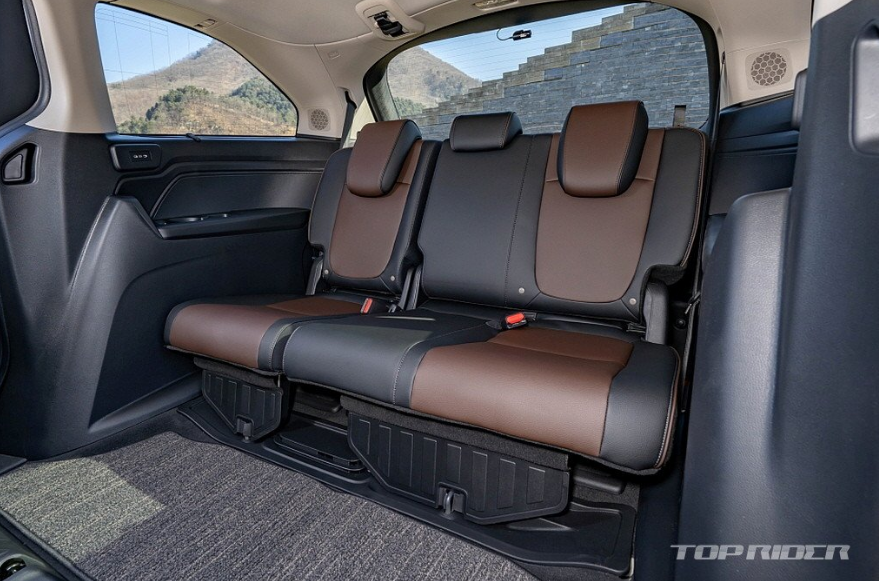 시트 구성이 독특한데, 2+3+3의 8인승과 2+2+3의 7인승을 함께 지원합니다. 2열 가운데 시트를 탈착해 트렁크 하단에 보관할 수 있습니다. 4인 혹은 3인으로 구성된 두 가족이 함께 여행할 경우 유용합니다. 2열 시트가 앞뒤뿐만 아니라 좌우로 이동할 수 있는 점은 동급에서 유일한 기능입니다.