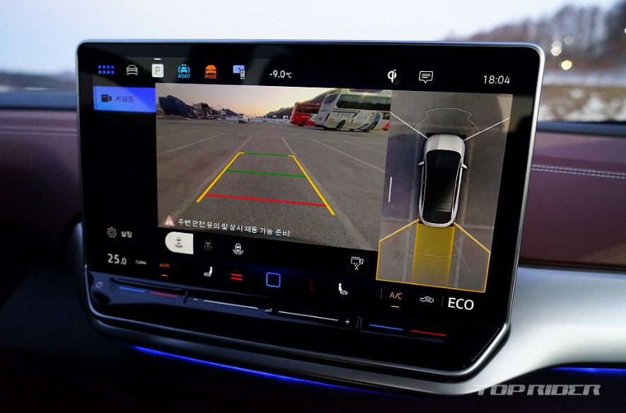 운전석에서의 시트포지션은 안정적입니다. 내연기관 기반 전기차나 일부 전기차가 차체 하단부 배터리팩으로 인해 바닥이 높게 느껴지는 것과는 다른 설정입니다. 시트포지션의 중요성을 강조하는 폭스바겐 다운 모습입니다. 전방은 물론 후방과 사이드미러까지 넓은 시야를 확보한 모습입니다.