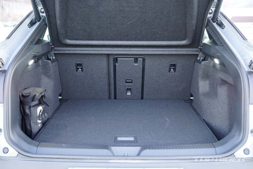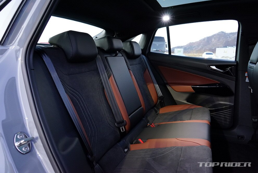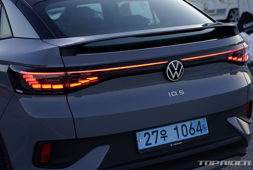 후면부 디자인은 일체형 스포일러와 완만한 루프라인을 통해 완전히 다른 느낌을 전합니다. 양산차에서는 오랜만에 적용된 보디 일체형 스포일러는 공기역학 성능을 높여줍니다. ID.5는 쿠페형 실루엣을 선택했지만, 트렁크 공간의 실사용 체적이나 2열 헤드룸에서 ID.4와 큰 차이가 없습니다.